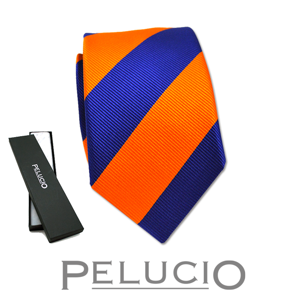 Super gave oranje stropdas met een vol blauw brede streep, met deze stropdas zult u zeker opvallen.